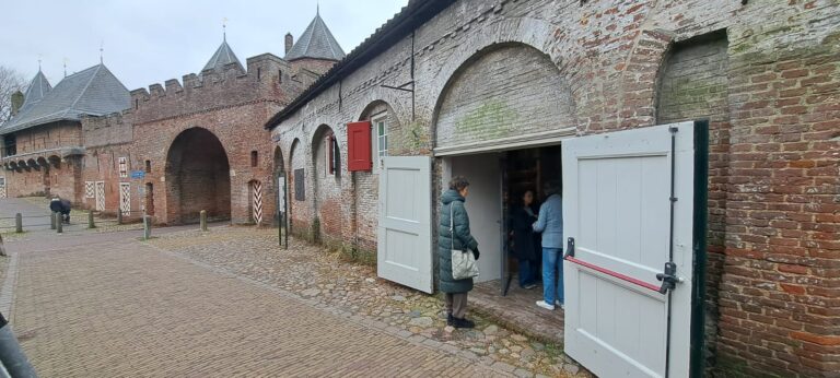 On the outside wall of the back of the building a trace of a water wheel can be seen. The wheel was used to power a fulling mill that had been situated inside the building in the 17th century.1 Fulling is the process of felting woven fabrics using water, urine, and clay, turning them into watertight fabrics called ‘laken’ that could be used for clothes or curtains because of their insulating properties. This process used to be a handwork process, until the watermill provided the possibility for a industrialization of this process. In 1645 the city decided to build a fulling mill, called the Volmolen for 1500 guilders.2 The Volmolen was placed on the outskirts of the city, inside the city wall of Amersfoort next to the koppelpoort, the gate into the city. 3 In 1669 two big problems arose within the fulling mill; a sewage leak occured underneath the watermill and a few months later a leak in the fulling mill caused water to spill inside the mill that endangered the water level within the city as well as the foundations of the fulling mill and the koppelpoort.4 A year later the decision was made to sell the mill for 1570 guilders.5