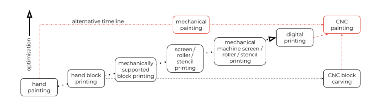 We have created a visualisation of the evolution of textile printing from hand painting to modern digital printing, with the steps in between representing further optimisation towards upscaling quantities. The last step of this optimisation is digital printing, which has been in development since the late 80s. Our research within Tracks4Crafts builds on previous printing methods and explores alternative timelines (shown in red) – what would have happened if the optimisation of hand painting hadn’t been a block, but the mechanisation of the brush stroke? What would mechanical painting have looked like after the Industrial Revolution? What it could be now – CNC painting and printing – and how this relates back to the craftsperson in the process is what we’re exploring in our pilot.