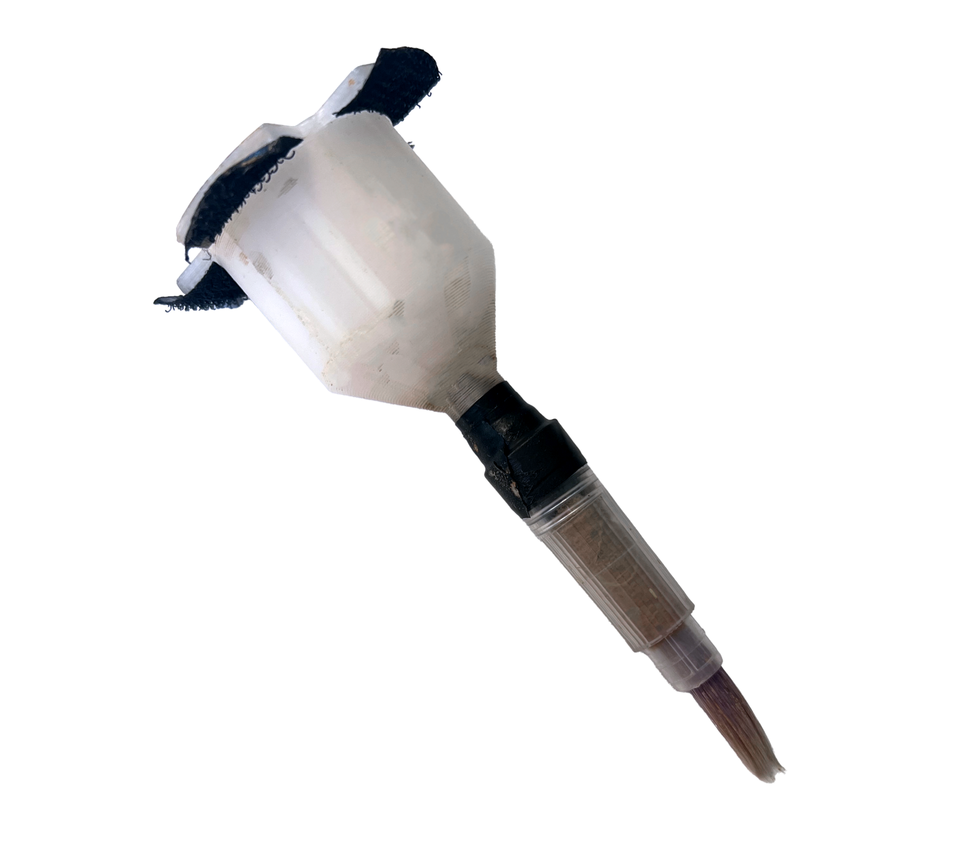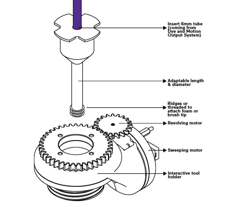 The brushes all fit into the Interactive tool holder. This tool holder is adapted by taking away the collet system, replacing it with a universal tool diameter and velcro connection.