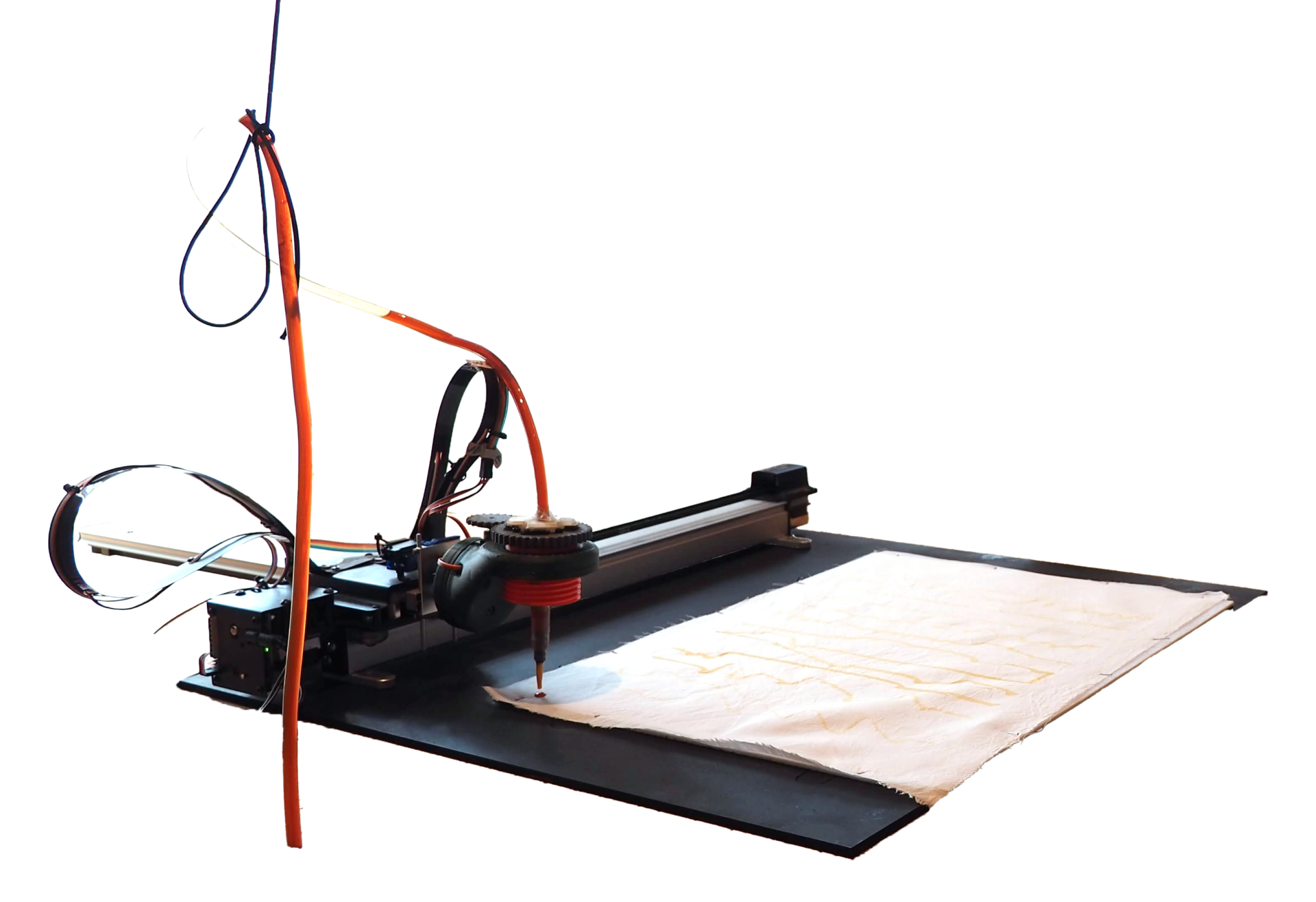 To ensure alignment with the tool holder and easy pinning and tensioning of the fabric, we made a mounting plate for the AxiDraw with felt on top. However, if you want to make quick tests without the risk of ink dripping while it is still wet, you need to be able to easily take out the fabric without tilting or unpinning it. This is why we made a simple system consisting of a machine base plate and a interchangeable felt base plate.