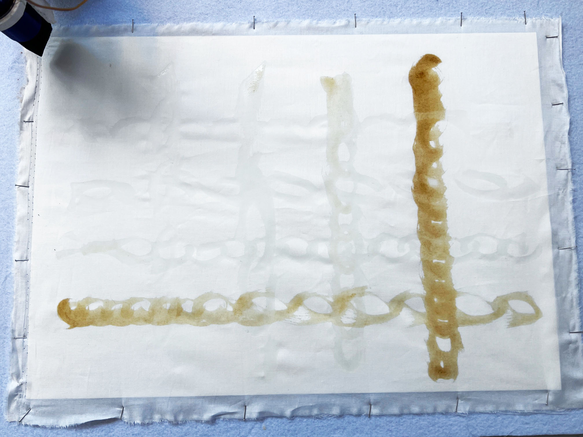 Is executed in 2 steps, drying and immersion dunging. Thorough drying of the textile of at least 1-2 days is required. The textile is ready when no smell is left behind on the printed areas. The dunging is traditionally done with dung, hence the name, to bring back the same process we use a cup of bran in 10 litres of water, with an addition of a table spoon of chalk to finalise the neutralisation of the solutions. The fixation process will ensure that the mordants wont leak into the water and affect one another.
