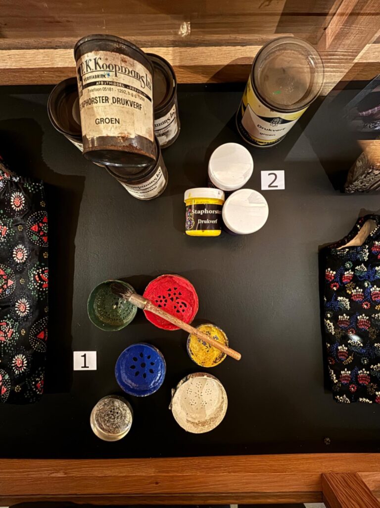 The Staphorst Stipwerk Stichting is now looking to create a new version of the dotwork paint, one that follows a known recipe and is sustainable in order to provide a essential building block to keep the heritage of Staphorster dotwork alive. The journey towards this paint isn’t easy as every charactaristic of the paint has to be taken into consideration. When the paint is too thick it might create little spikes instead of the characteristic dome-like dots. When it doesn’t have elasticity the paint might crack when dried. And it can’t be absorbed too much into the fabric because it wouldn’t create the 3D dot effect. In addtion, It should be water-fast and washable and above all, it should be glossy. In a latest test of a new paint created in cooperation with a paint factory the paint dried almost perfectly, but lost the glossiness. However, the ‘drukkers’ don’t want to compromise on their own paint standards. If they did so, the intangible cultural heritage of the paint and the dotwork itself wouldn’t be protected. The story around the Staphorster dotwork paint visualizes the need for innovation and open-source practises in the protection of intangible cultural heritage but also how sustainability goals can endanger recently established heritage practices.
